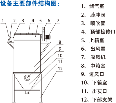 | 設(shè)備型號(hào) | 處理風(fēng)量 (m3/h) | 過(guò)濾面積 (m2) | 濾袋 數(shù)量 | 過(guò)濾風(fēng)速 (m/min) | 阻力 (Pa) | 進(jìn)口 濃度 (g/m3) | 出口 濃度 (g/m3) | 清灰壓縮 空氣壓力 (MPa) | 脈沖閥 數(shù)量 |