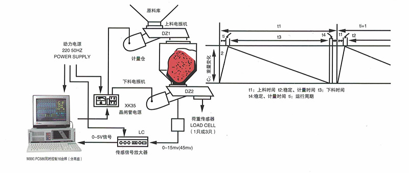 上料電振機(jī)和稱量斗是軟連結(jié)的,重力分離,下料電振機(jī)雖也是軟連結(jié),但其重力和稱量斗整體由三只拉力傳感器支撐的,由稱量斗內(nèi)料柱連結(jié)。工作時首先由上料電振機(jī)向稱量斗給料,當(dāng)達(dá)到料倉給定重量的給定上限值時,停止給料。間隔一段時間后,下料電振機(jī)開始卸料,當(dāng)卸料至給定的重量下限值時,停止卸料;如此重復(fù)動作。物料的流量計量是由料倉內(nèi)失去的物料重量多少來確定,因此叫失重定量給料機(jī)。
