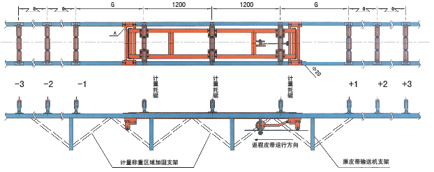 說(shuō)明:1、稱重架 2、稱重橋 3、原輸送機(jī)托輥改制的計(jì)量托輥 4、測(cè)速車及測(cè)速傳感器 5、輔助輥 6、輸送機(jī)框架
